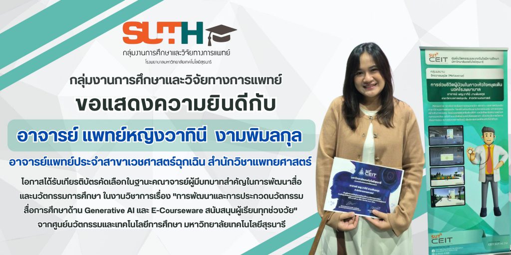 ขอแสดงความยินดีกับ อาจารย์ แพทย์หญิงวาทินี งามพิมลกุล อาจารย์แพทย์ประจำสาขาเวชศาสตร์ฉุกเฉิน สำนักวิชาแพทยศาสตร์ โอกาสได้รับเกียรติบัตรคัดเลือกในฐานะคณาจารย์ผู้มีบทบาทสำคัญในการพัฒนาสื่อและนวัตกรรมการศึกษา