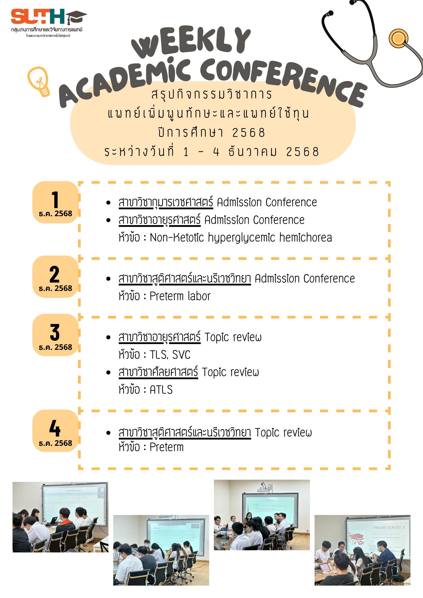 โรงพยาบาลมหาวิทยาลัยเทคโนโลยีสุรนารี ได้จัดกิจกรรมวิชาการ แพทย์เพิ่มพูนทักษะและแพทย์ใช้ทุน ประจำปีการศึกษา 2568 เมื่อวันที่ 1 – 4 ธันวาคม 2568